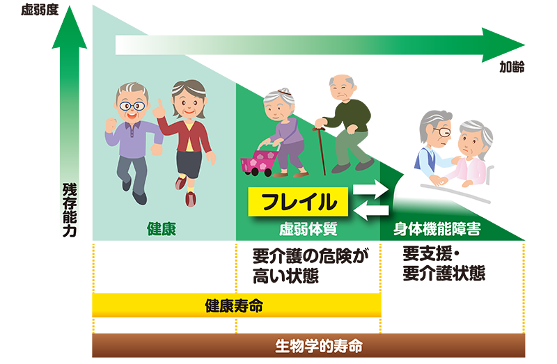 フレイルとは加齢により体力や気力が弱まっている状態のことです。 以前は「虚弱」などと呼ばれていましたが、「身体的問題」のみならず「認知機能障害などの精神的・心理的問題」「経済的困窮などの社会的問題」などさまざまな面からなる概念です。 フレイルは介護が必要になる前段階とも表現できます。 適切な介入により再び健康に戻ることも期待できるため、早めの気づきと対策が重要とされていて健康寿命(援助が必要ない・要介護状態でない期間)を延伸させるために国を挙げた取り組みが行われています。