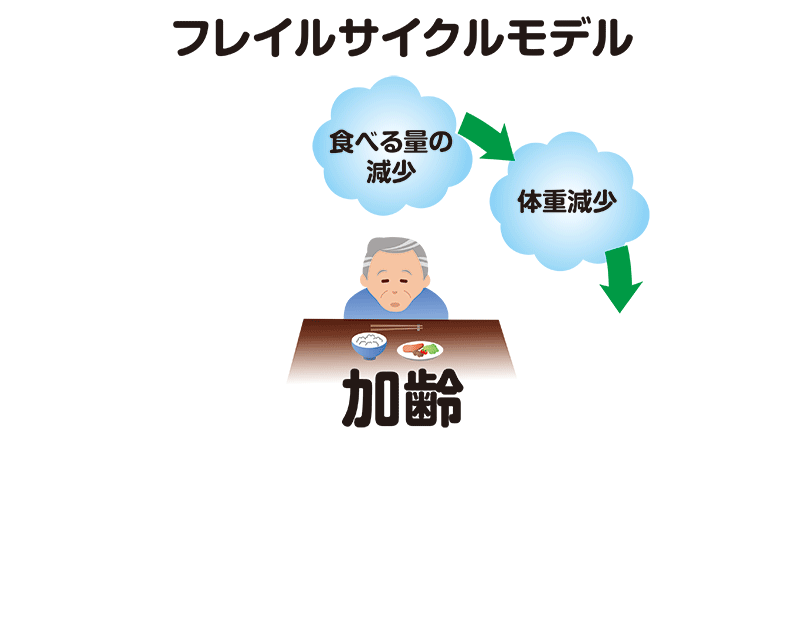 フレイルの要因が重なり、悪循環に陥った状態がフレイルサイクルです。 筋力低下が始まりのものや、食欲不振が始まりのものがあります。 たとえば筋力低下で始まる場合では、加齢や病気によって筋肉量が減り体の機能が低下します。足の筋肉量が減ると歩く速度が落ちたり、疲れやすくなって活動量が減ったりします。活動量が減ると消費エネルギーが減るため、食欲も無くなります。 そうすると低栄養の状態になり、栄養不足によってさらに筋力低下が進んでいくという悪循環が起こり、ますます健康状態が悪化していきます。