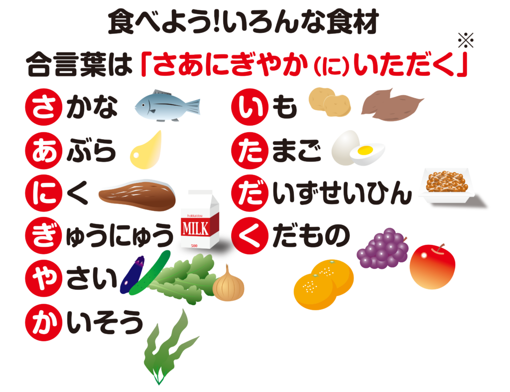「さあにぎやかにいただく」 (下記参照)といった言葉で表されることもあります、この10の食品群の中から毎日7種類以上をとるようにしたいところです。