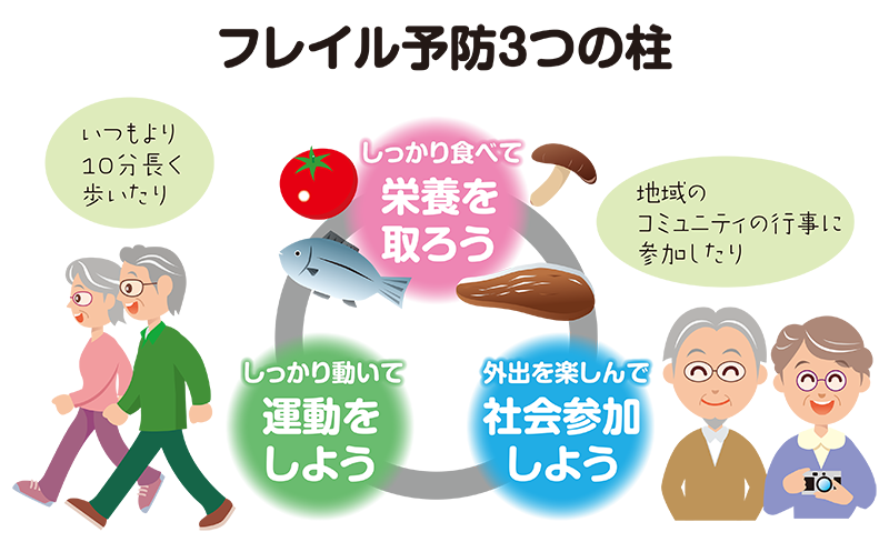 「食事」「身体活動」「社会参加」の3つが予防のための柱と言われています。 互いに影響しあっているので日常生活に取り入れていくことが大切です。